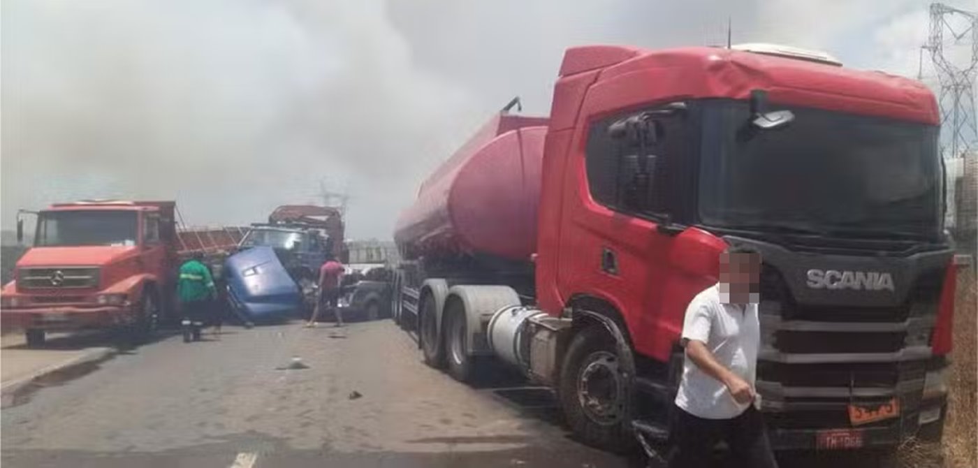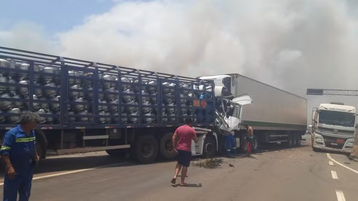 Imagens registradas por motoristas mostram vários veículos colidindo, entre eles uma viatura da PRF e uma carreta com botijões de gás de cozinha.