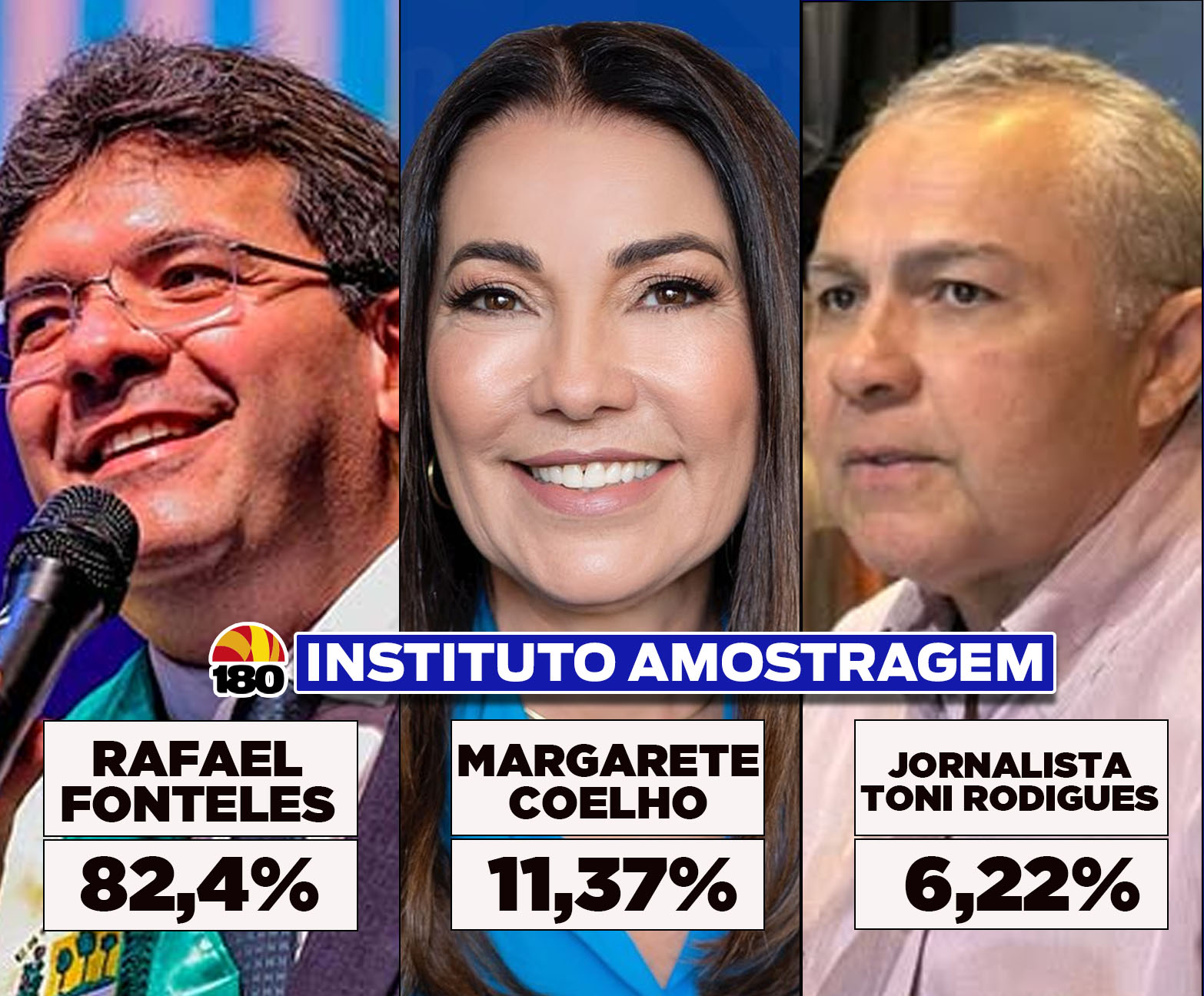 No confronto com Margarete e Toni Rodrigues, Rafael teria 82,4%, Margarete 11,37% e Toni 6,22%.