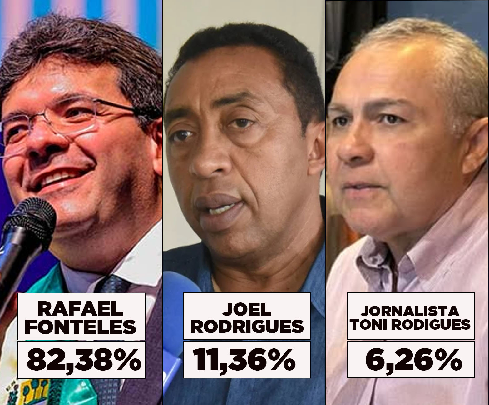 Em outro cenário, com Joel Rodrigues e o jornalista Toni Rodrigues (PL) como adversários, Rafael alcançaria 82,38%, contra 11,36% de Joel e 6,26% de Toni.