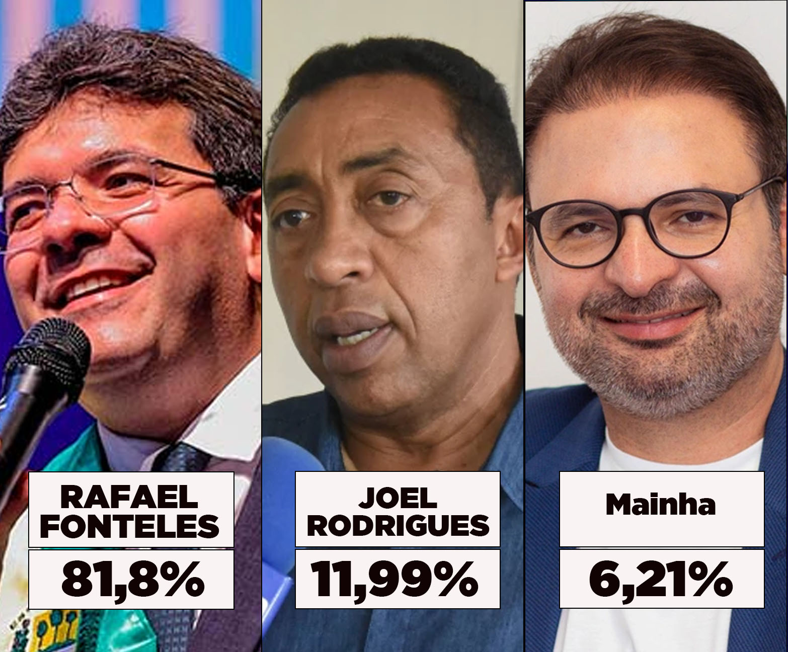 Com Joel Rodrigues (Progressistas) e Mainha (sem partido), Rafael teria 81,8% dos votos válidos, contra 11,99% de Joel e 6,21% de Mainha.
