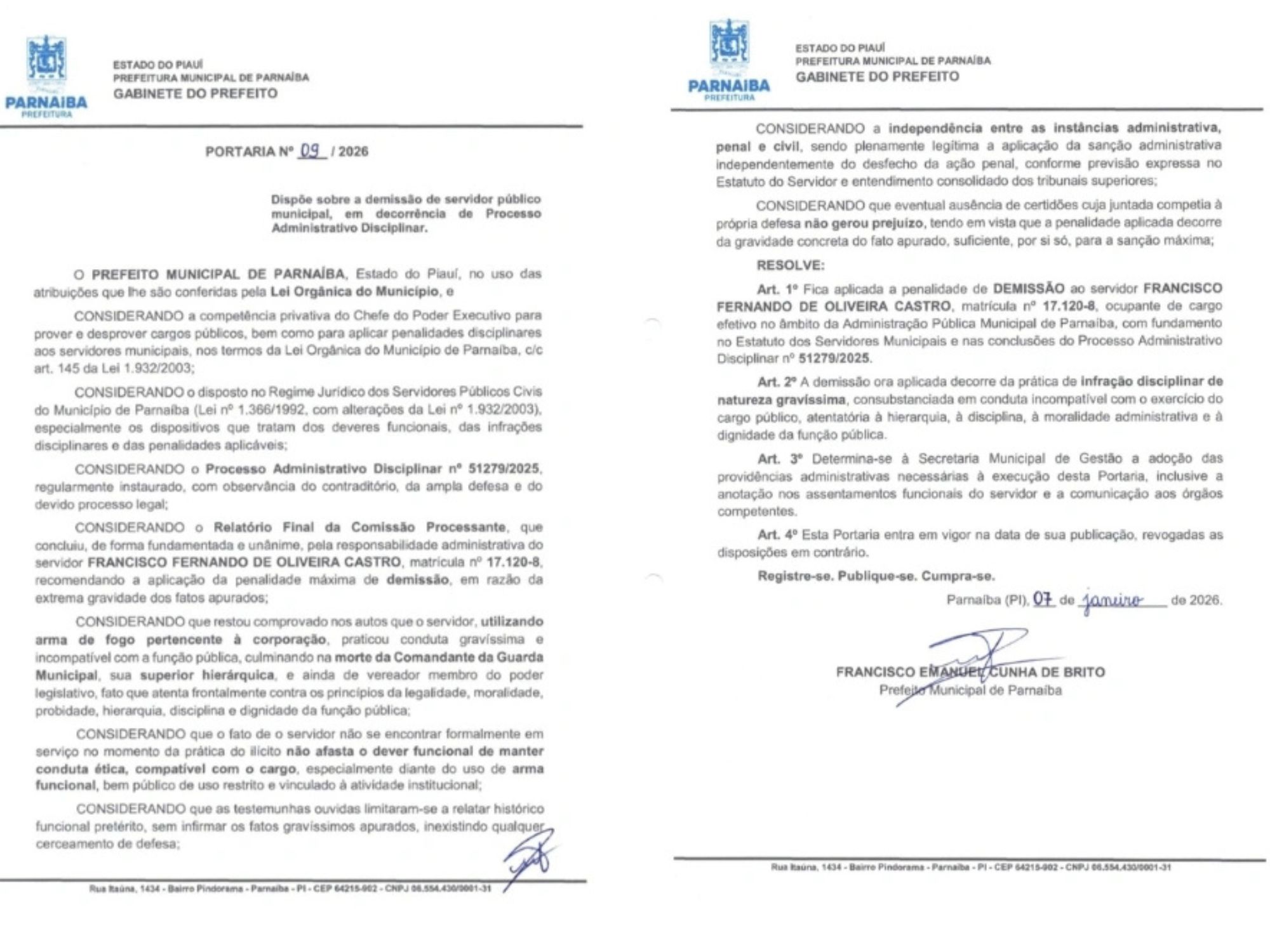 Foi publicada no Diário Oficial do Município de Parnaíba, nesta quinta-feira (8/1), a expulsão do servidor Francisco Fernando, acusado de assassinar a tiros a ex-mulher, a guarda civil municipal e chefe da corporação Penélope Brito, e o vereador Thiciano Ribeiro. O crime ocorreu no dia 27 de agosto de 2025, no Centro de Teresina, e teve grande repercussão no Piauí.